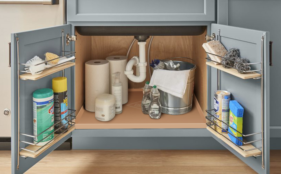 48 out of 5 stars 346 ratings. Eapele Under Sink Mat Kitchen Cabinet Tray 34 x 22 Flexible Waterproof Silicone Made Hold up to 33 Gallons Liquid Peach Brand. Of water in the event of a leak or product spill.