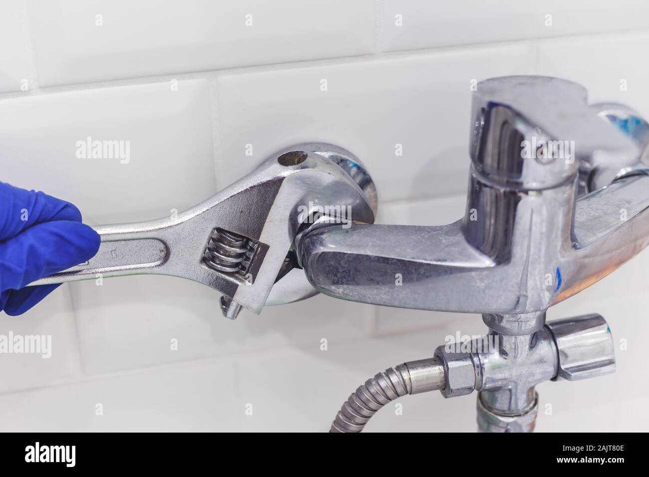 Plumber Uses Pipe Wrench For Service Shower Mixer Tap Stock Photo Alamy
